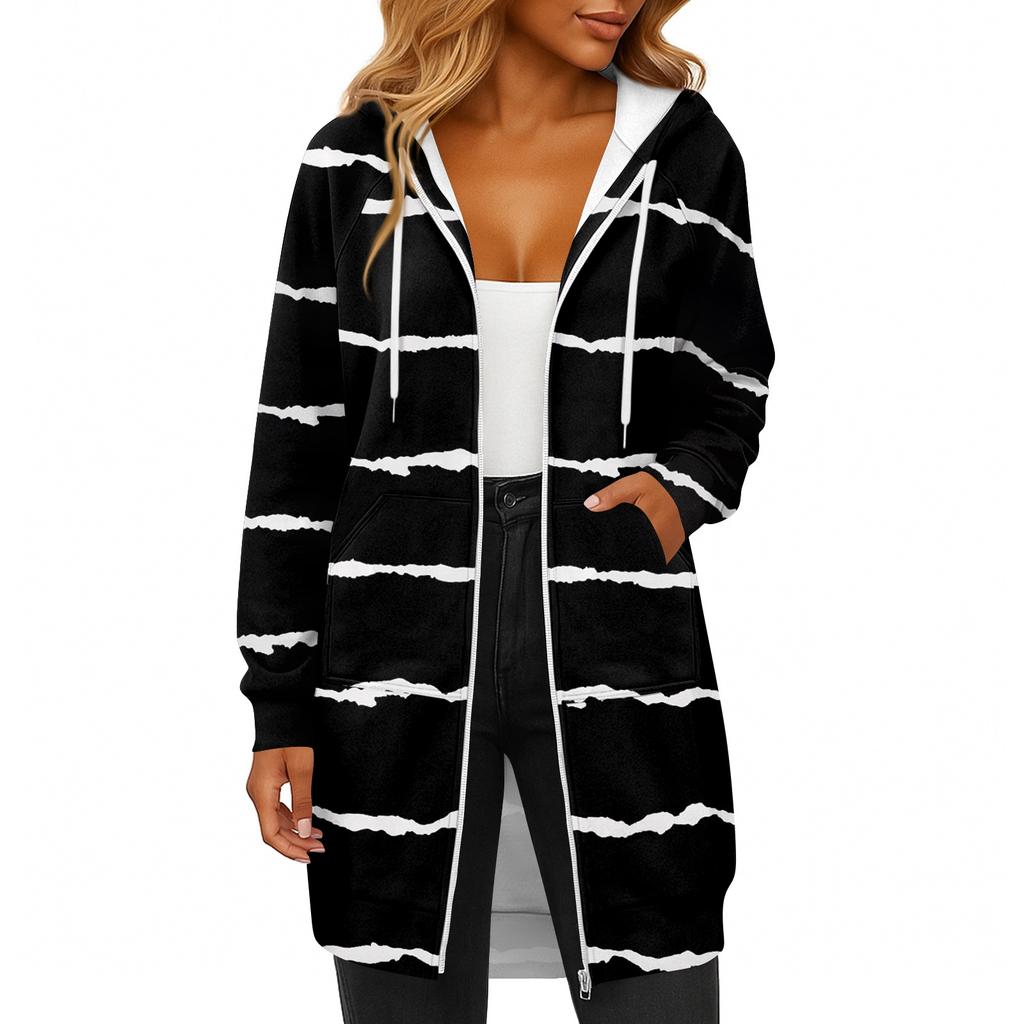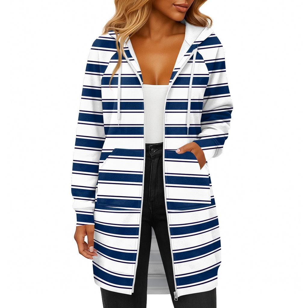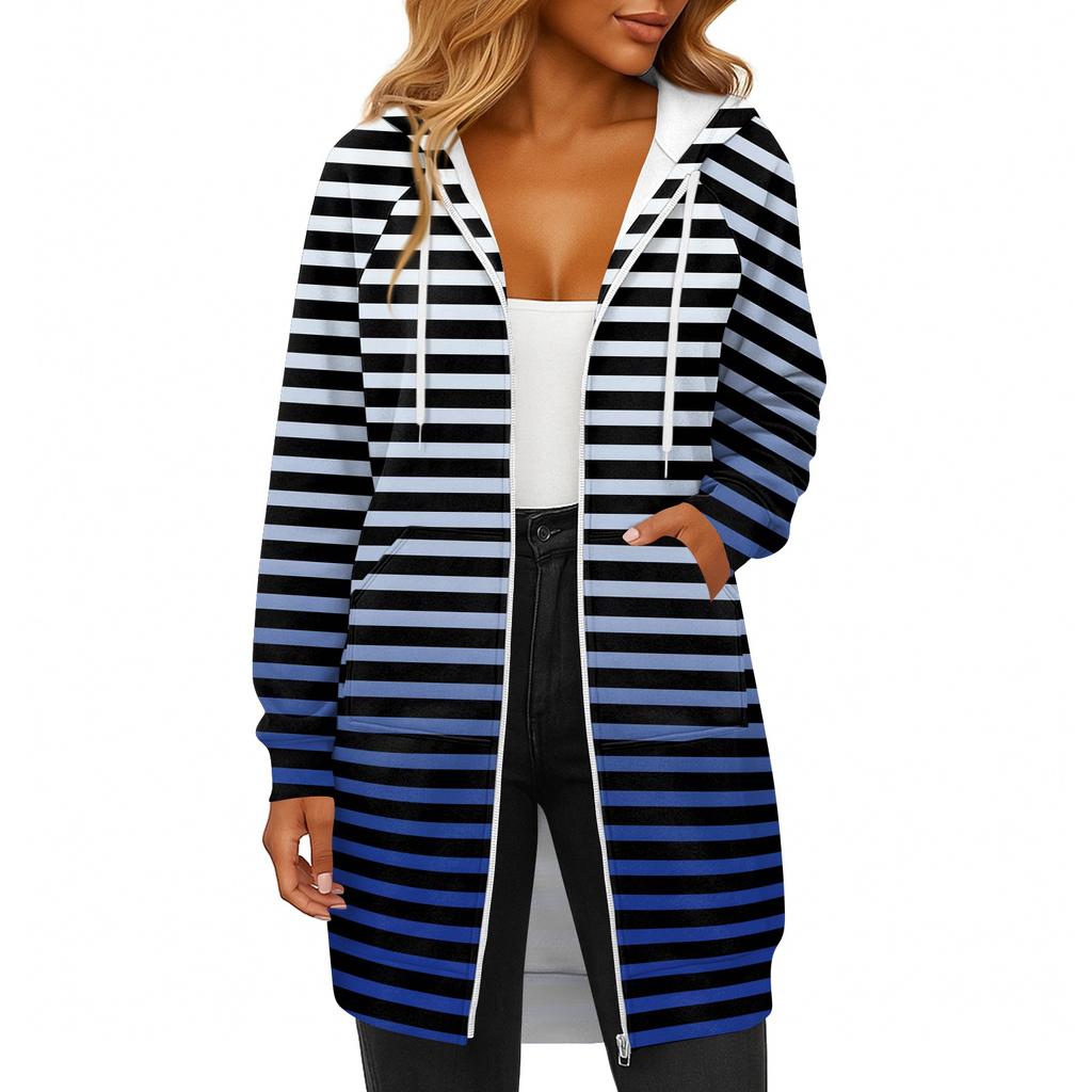 Женская модная полосатая с принтом толстовка с длинным рукавом, капюшоном на шнурке, карманом на молнии, длинная повседневная куртка-свитшот