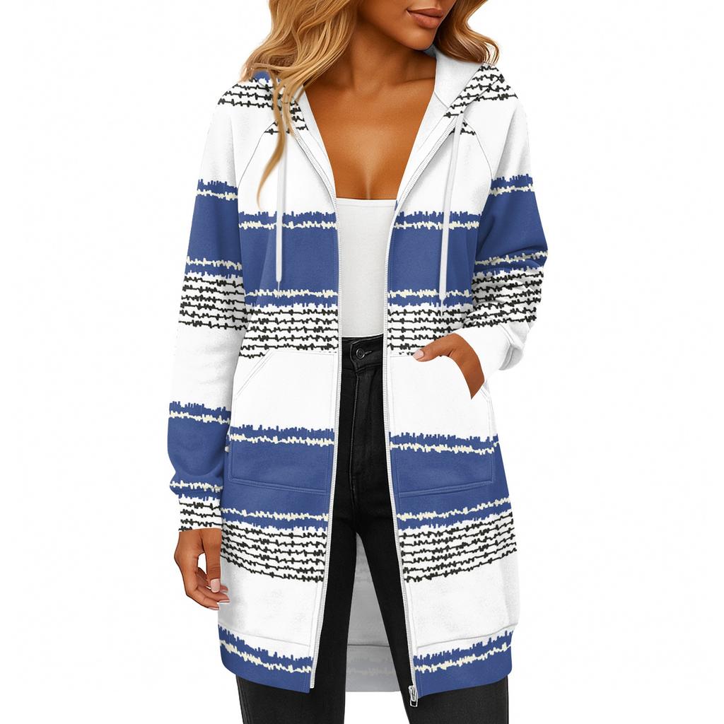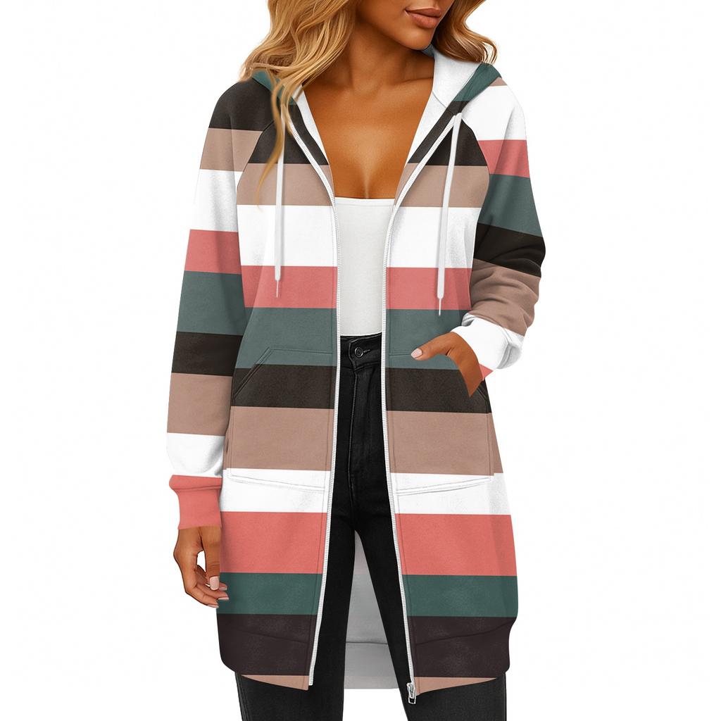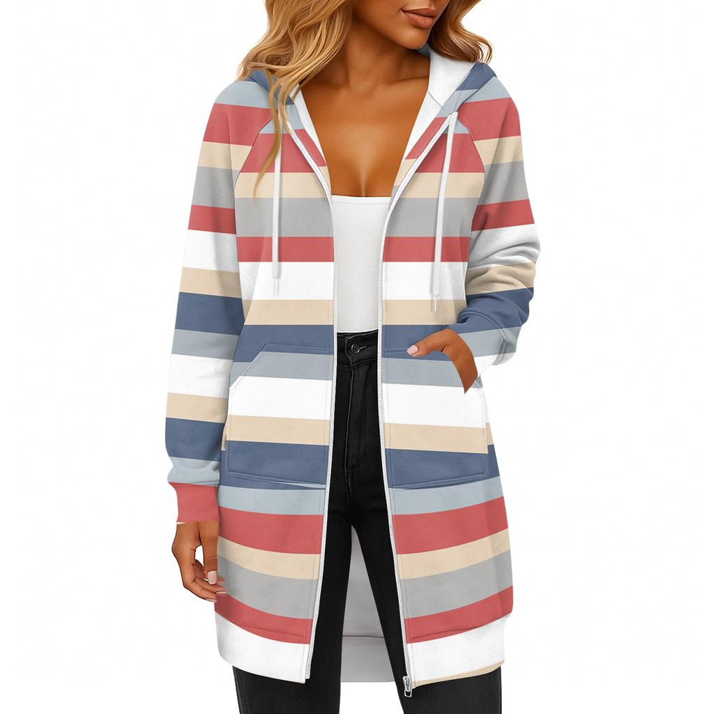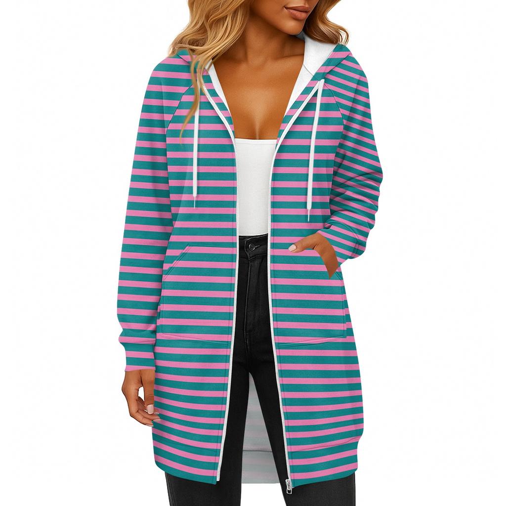 Женская модная полосатая с принтом толстовка с длинным рукавом, капюшоном на шнурке, карманом на молнии, длинная повседневная куртка-свитшот