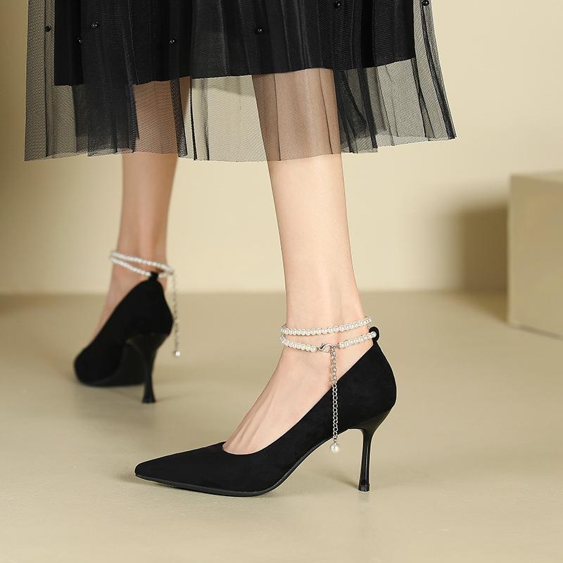 1-Word pearl suede single shoes women's pointed head stiletto high heels sexy bride bridesmaid Xiuhe wedding shoes