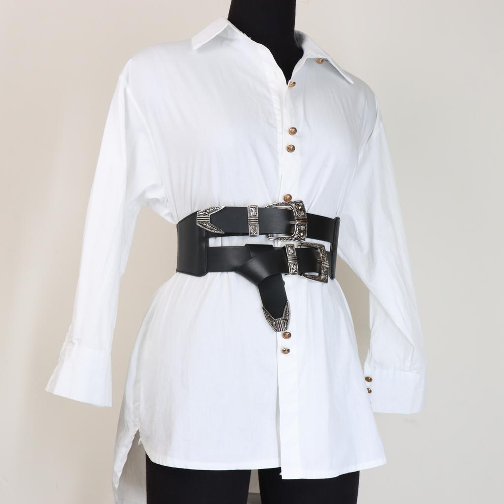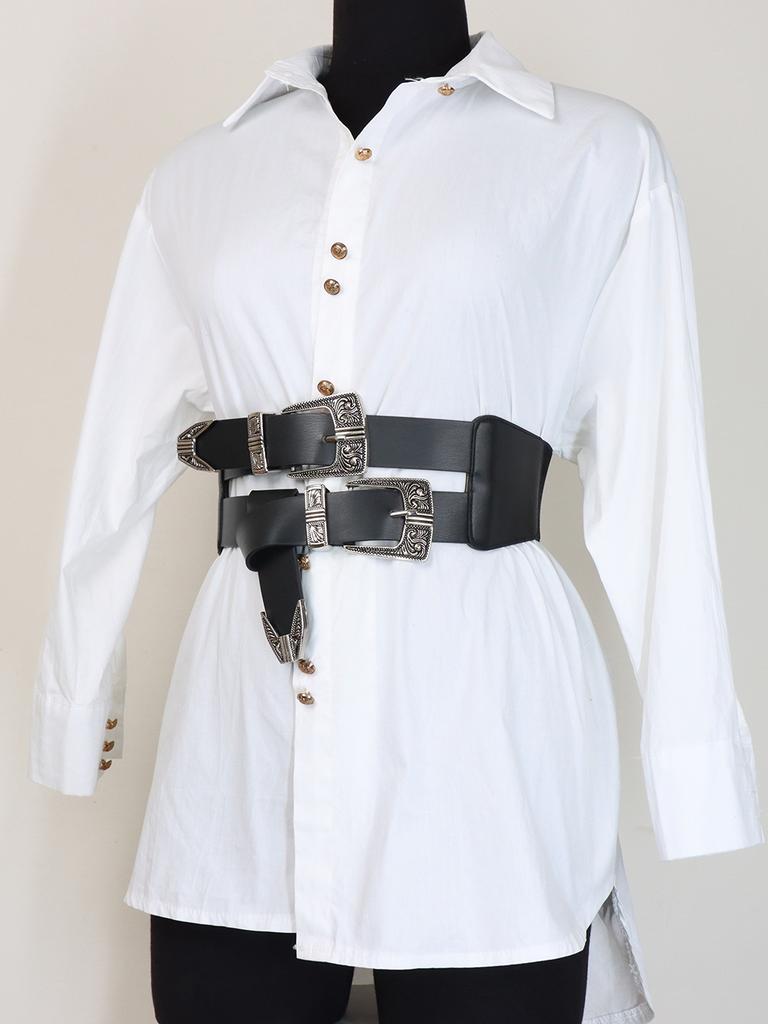 Женский ПУ ремень Ретро резная сплавная пряжка Двухрядный ремень Широкий ремень Универсальные джинсы Аксессуары для одежды