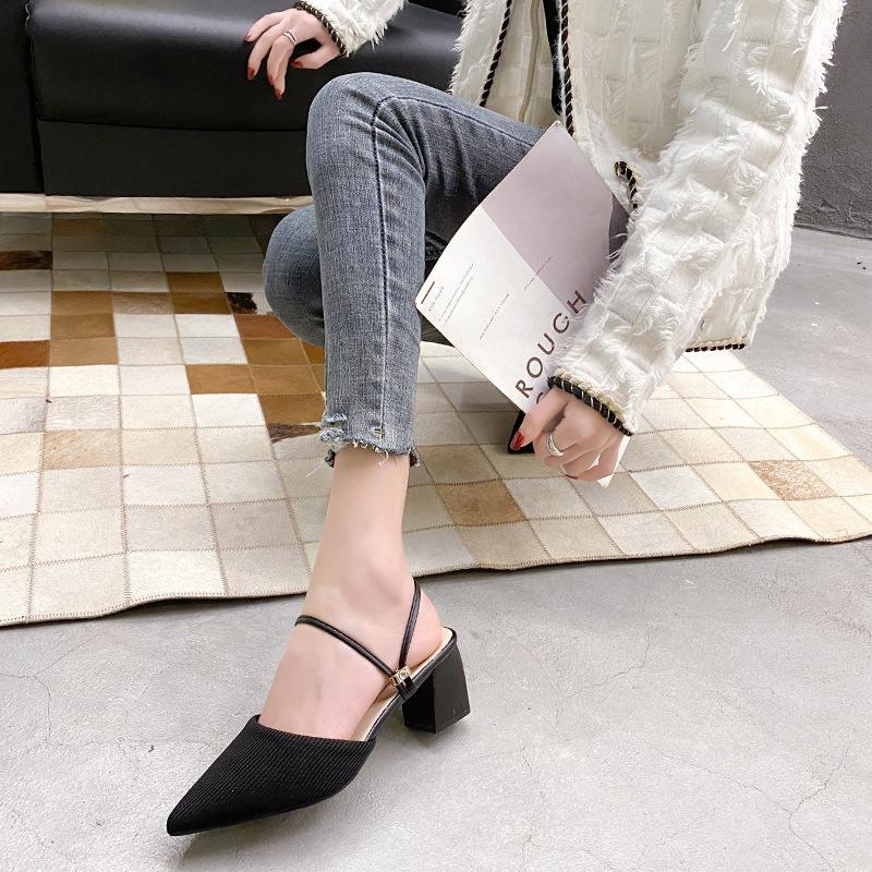 Сумка с острым носком, голова сумки, средний каблук, толстый каблук, крутые шлепанцы, сандалии-полусабо, женские, лето 2020, новая тканевая верхняя одежда