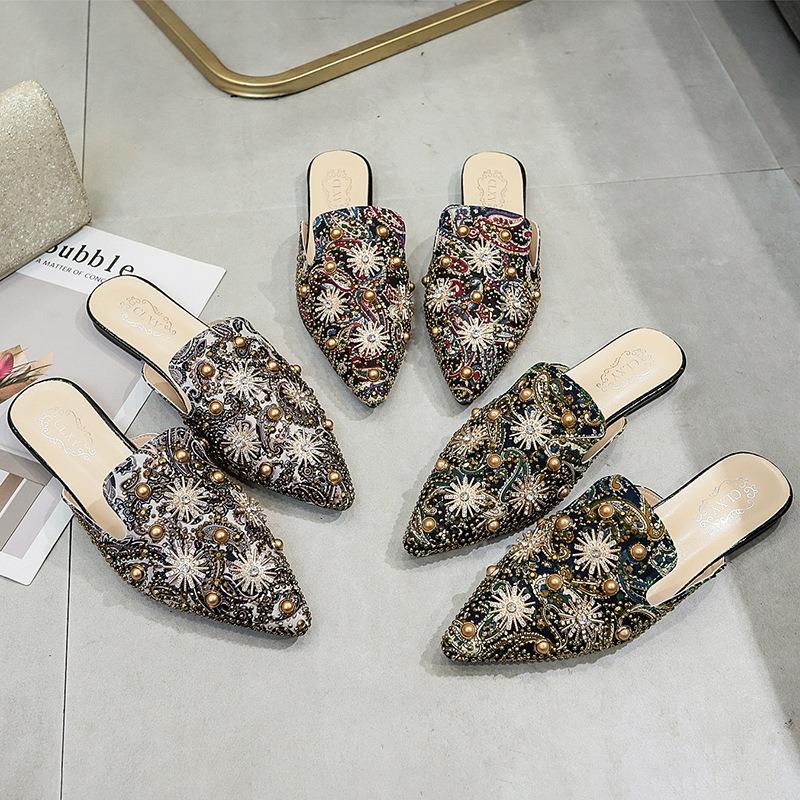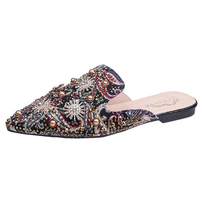 Весна и лето новый сексуальный принт горячие заклепки-бриллианты жемчуг остроносый сумка-голова граффити тапочки на одной подошве
