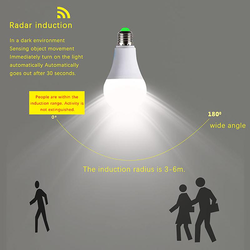Светодиодная лампочка с активацией движения автоматически включается при обнаружении движения (любой движущийся объект, включая домашних животных) и автоматически выключается после отсутствия движения в течение 30 секунд. Расстояние обнаружения может достигать 3-6 метров.. (Примечание: После установки лампочки, пожалуйста, включите настенный выключатель, чтобы держать его в силе, он будет загораться в темноте.)