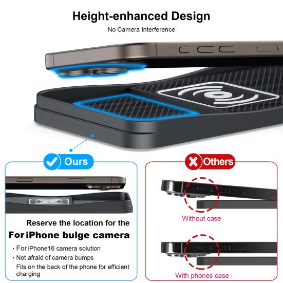 В отличие от традиционных плоских зарядных устройств, эта беспроводная зарядная панель имеет приподнятую платформу, которая надежно фиксирует заднюю панель вашего телефона, исключая тряску или зоны слабого заряда.. Наслаждайтесь идеальным контактом и бесперебойной зарядкой без каких-либо сбоев.