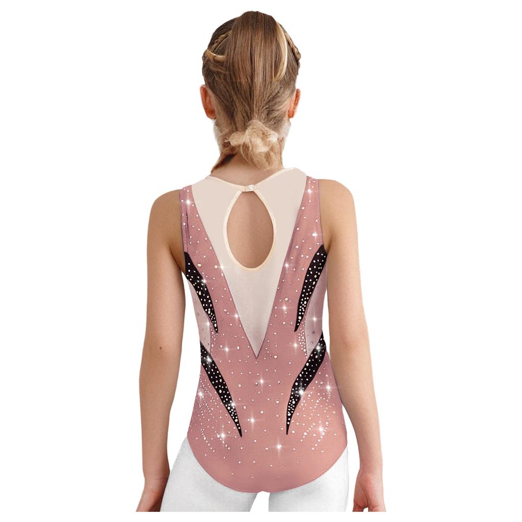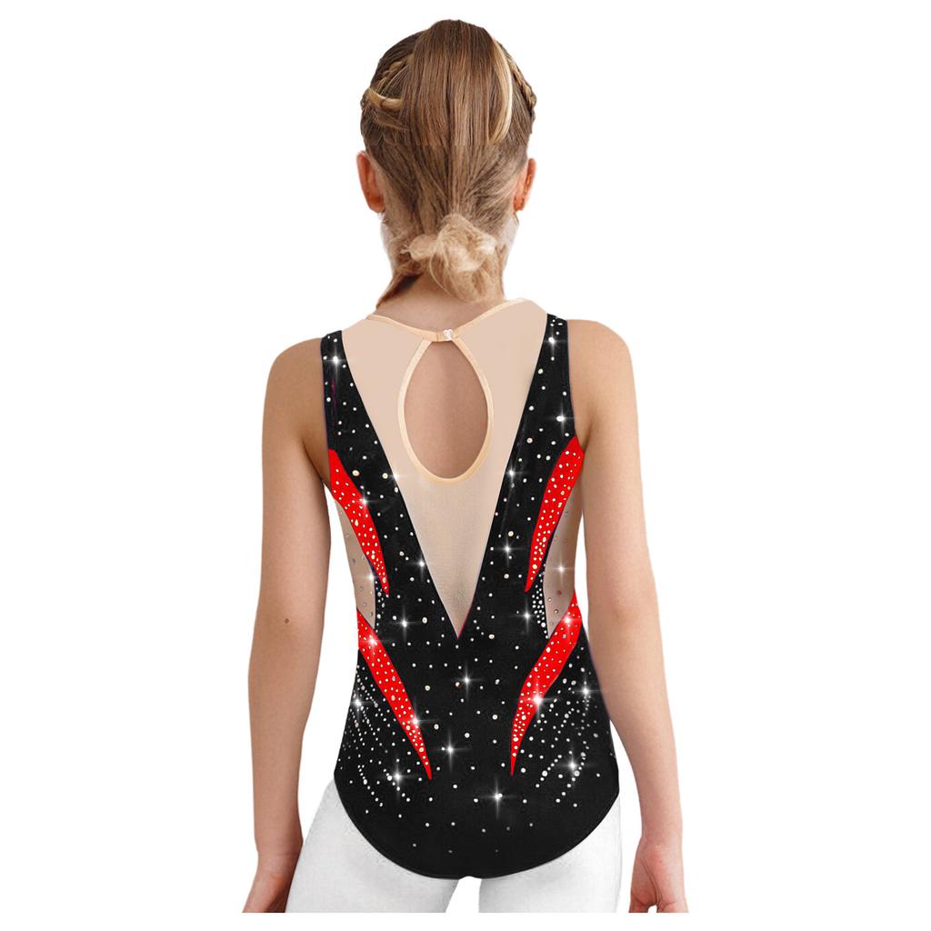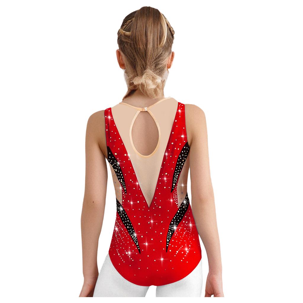 Девочки Металлический Гимнастический Танцевальный Купальник Без Рукавов С Вырезом Капелька На Спине Прозрачная Сетка Пэчворк Блестящие Стразы Боди