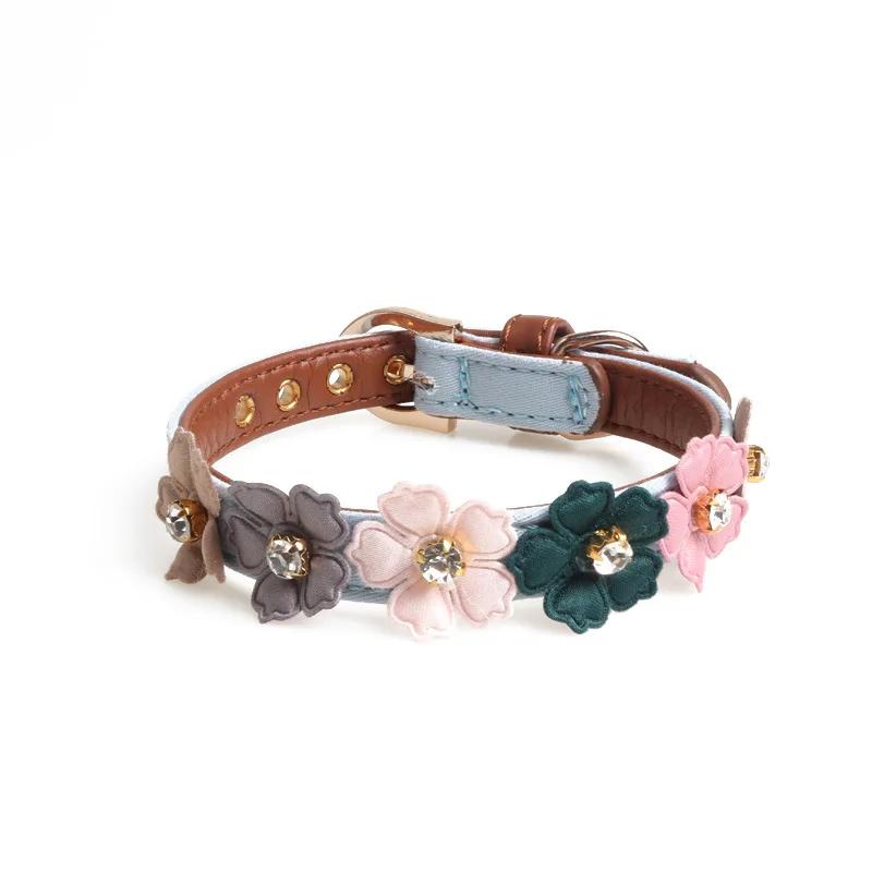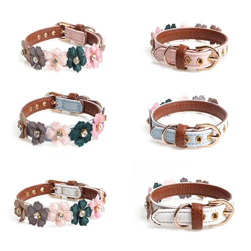 Ошейник для собак с цветочным принтом и стразами, цветочная цепочка из искусственной кожи, маленький и средний, для чихуахуа, мопса, товары для животных, ошейник для кошек и собак