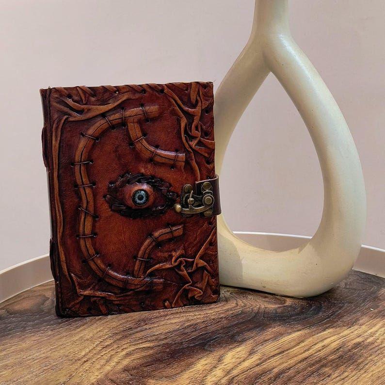 Spell Book of Shadows • Antique Leather Journal with Magic Eye & Lock • Halloween Decor, Witchcraft Grimoire, Wiccan Gift