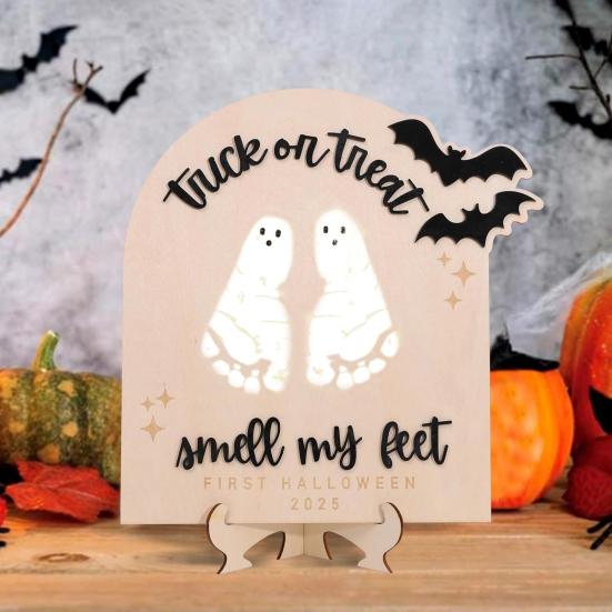 Центральным элементом являются два призрачных изображения, созданных из отпечатков ног, символизирующих первый Хэллоуин ребенка. ("ПЕРВЫЙ ХЭЛЛОУИН 2025"). Этот декоративный элемент не только идеально подходит для добавления жутковатого штриха вашему дому, но и служит памятным сувениром для празднования особых случаев.. Получите свой сегодня и поднимите свои украшения на Хэллоуин на новый уровень!
