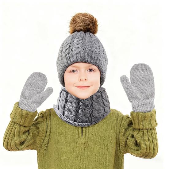 Набор из 3 предметов: детская шапка, шарф, перчатки, украшенный плюшевым помпоном, вязаный узором «косичка», утолщенный, теплый, без полей, длинный шарф, набор перчаток для сенсорного экрана