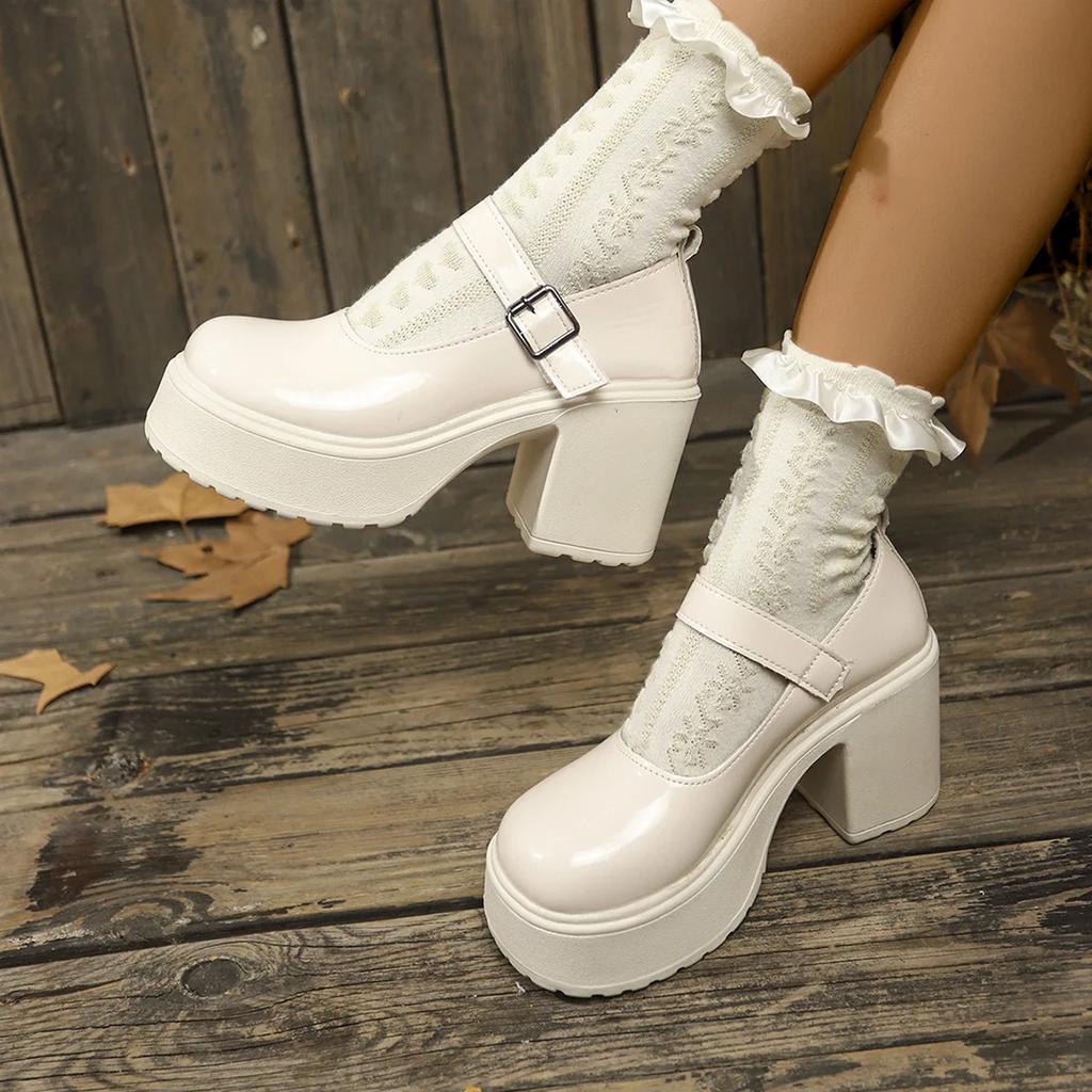 Модные туфли-лодочки на массивной платформе и высоком каблуке, женские, осенние, из искусственной кожи, с ремешком на щиколотке, туфли Мэри Джейн, женские туфли на толстом каблуке в стиле лолиты
