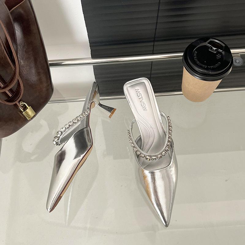 Мода 2025 Блестящие сандалии со стразами Женские туфли-мюли с ремешком Женские элегантные туфли-лодочки на каблуке с острым носком Женские роскошные вечерние туфли для вечеринки
