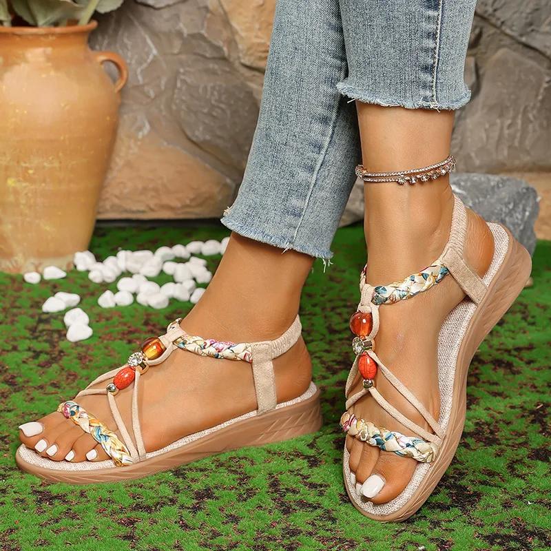 Fashion Fashion Beaded Bohemian Sandals for Women 2025 Summer Printing Braided Slip On Rome Shoes Woman Outdoor Non Slip Beach Sandalias
