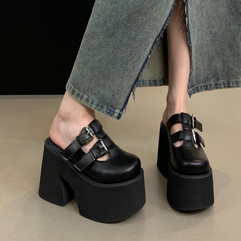 Мода 11см Туфли на блочном каблуке Черные туфли с закрытым носком Панк Платформа с пряжкой Массивные босоножки на каблуке Летняя женская повседневная обувь Sandalias Mujer
