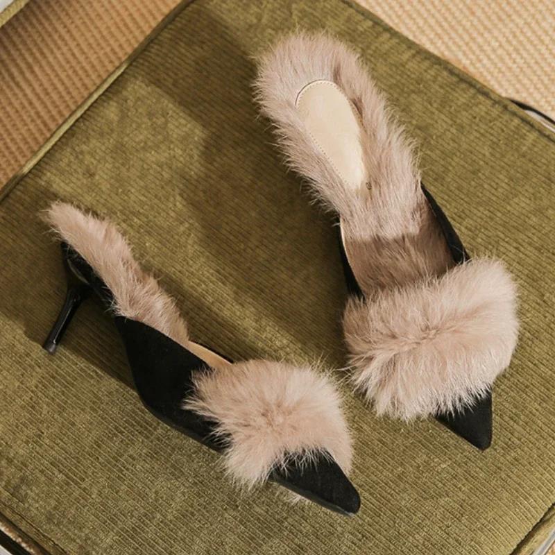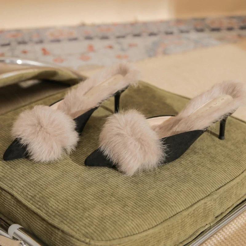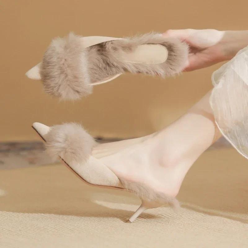 Модные новые осенне-зимние пушистые мюли-тапочки женские туфли-лодочки с острым носком теплые на высоком каблуке шлепанцы женские плюшевые на тонком каблуке тапочки женские