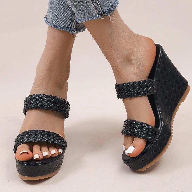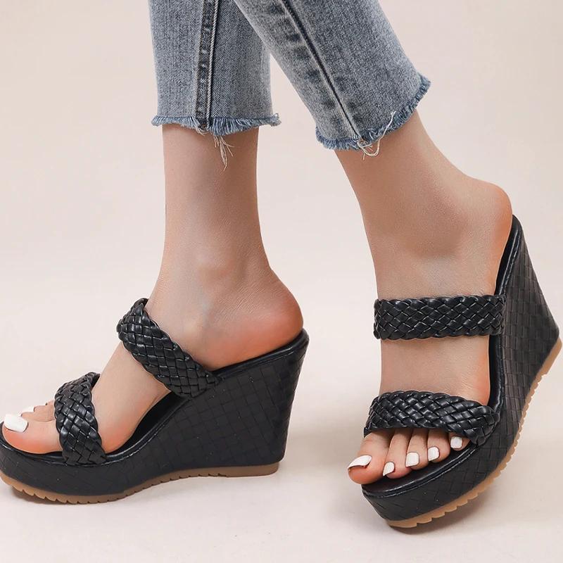 Fashion Women's Retro Thick Bottom High Heel Sandals Woven Patent Leather Wedge Sandal Female Office Ladies Non Slip Black Slides Mujer