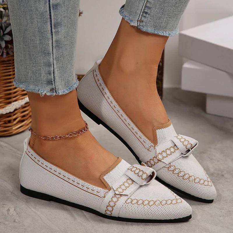 Модные женские балетки Rimocy 2025 Новые вязаные сетчатые дышащие лоферы Мягкие удобные с острым носком Повседневная обувь Тренд Декор с бантом Женская обувь