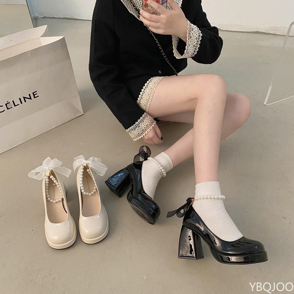 Модные женские туфли на высоком каблуке из французского жемчуга, модные туфли Мэри Джейн, туфли на толстом каблуке с бантом и пряжкой, женские сексуальные элегантные банкетные туфли Mujer De