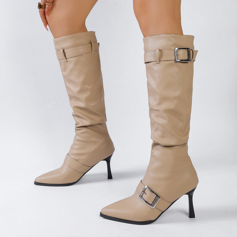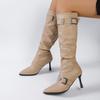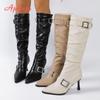 Мода Мода Металлическая Пряжка Декорация Длинные Сапоги для Женщин Однотонные Остроносые Осенние Сапоги до Колена Сексуальные Супер Высокий Каблук Вечерние Туфли