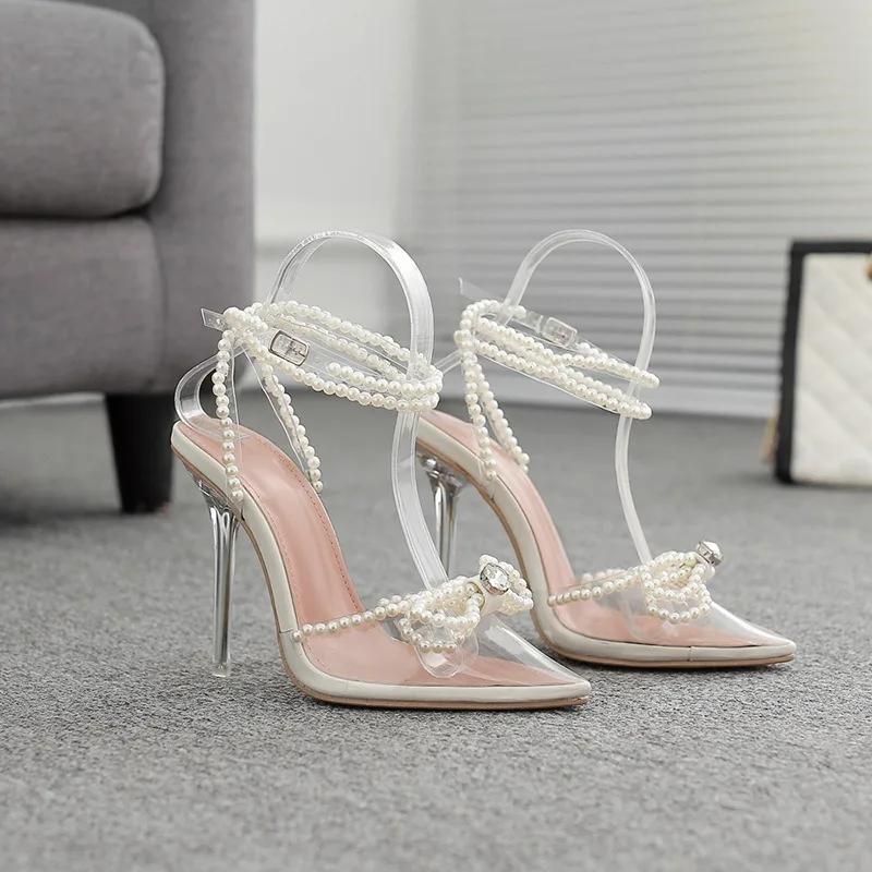 Модные Сексуальные Прозрачные ПВХ Стринги с Бусинами Женские Тонкие Туфли на Высоком Каблуке Стразы Бабочка-Узел Прозрачные Остроносые Сандалии-Лодочки с Ремешком и Пряжкой