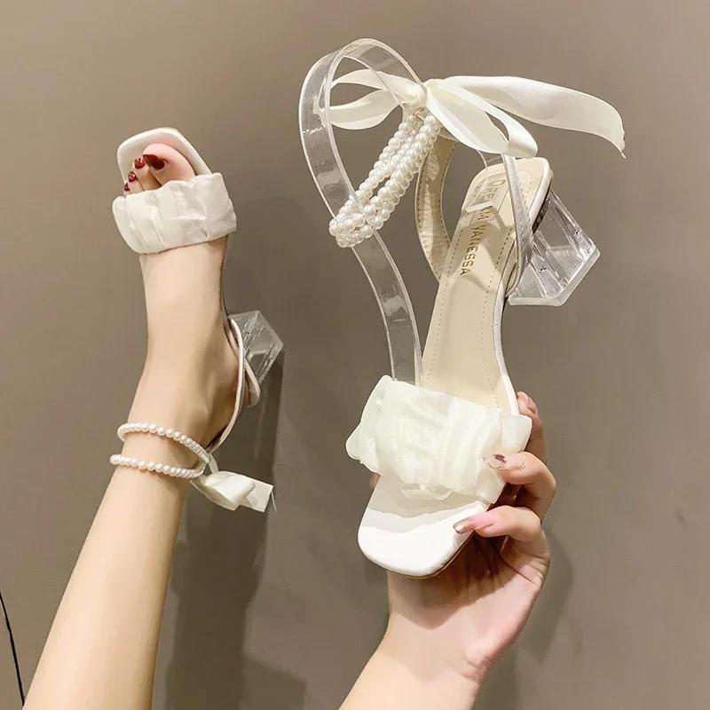 Модные свадебные туфли в стиле феи с квадратным носком, кружевной нитью и бусинами, прозрачные, на высоком каблуке, элегантные женские летние босоножки на высоком каблуке — купить товар онлайн с бесплатной доставкой по всему миру!