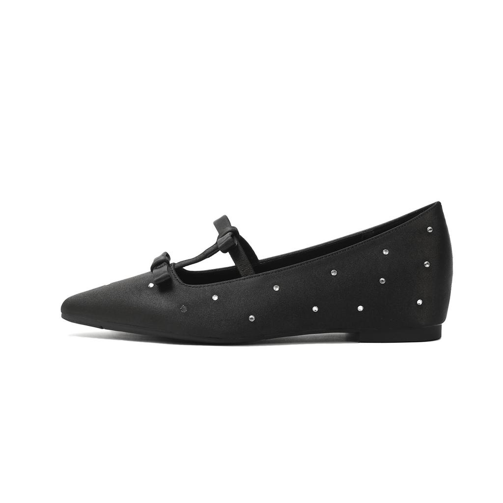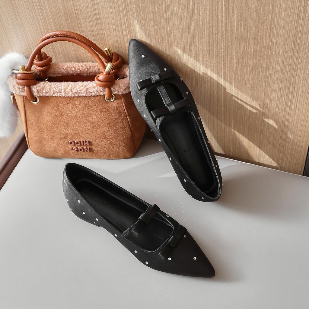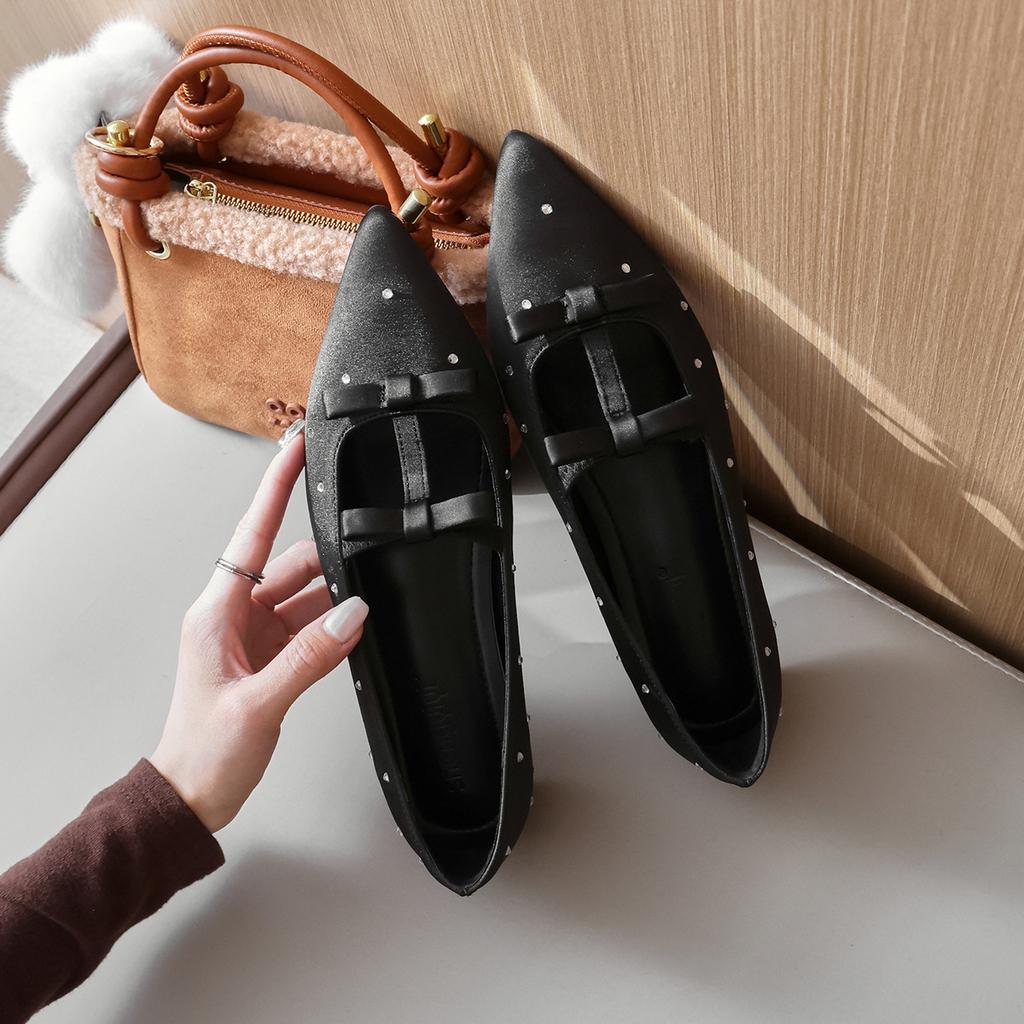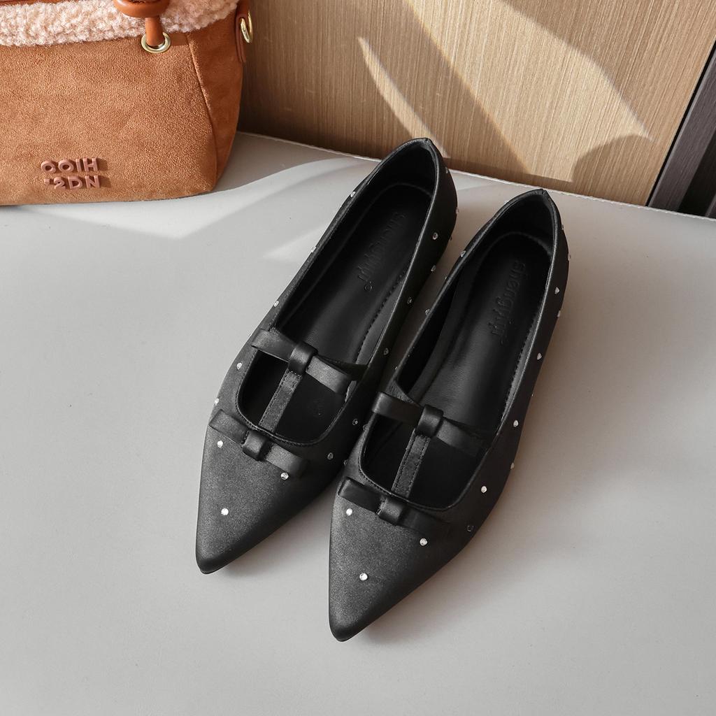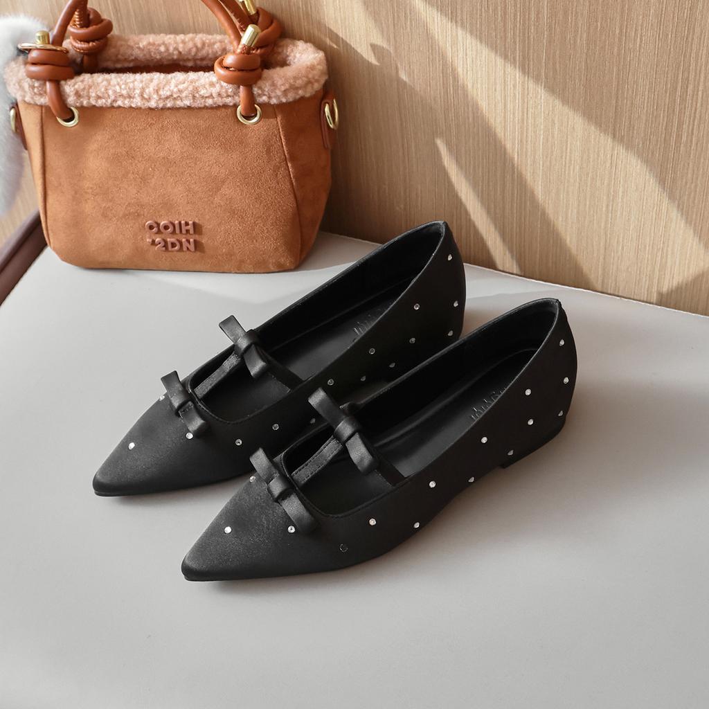 Fashion Flat Shoes for Women 2025 Spring and Autumn New Silk and Diamond Square Toe Increased Height 5cm Inside Bow Ladies Shoes
