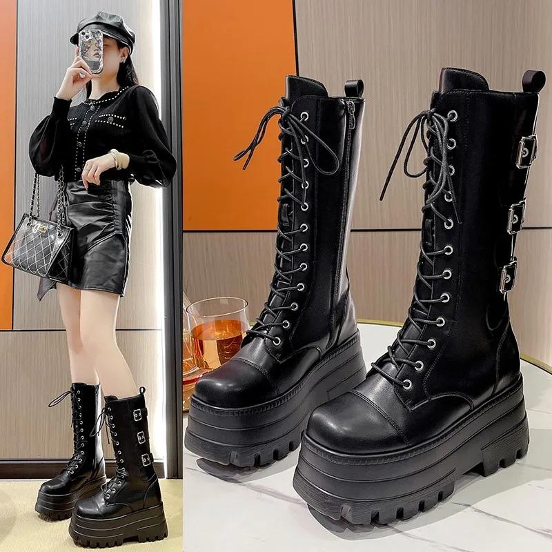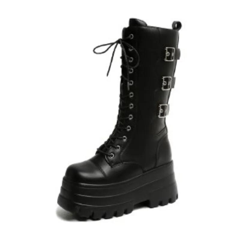 Мода Мода Массивный Высокий Каблук Полусапоги Женские Толстая Подошва Лакированная Кожа Панк Ботинки Женские Готические Черные Ботильоны на Платформе Боевые Ботинки