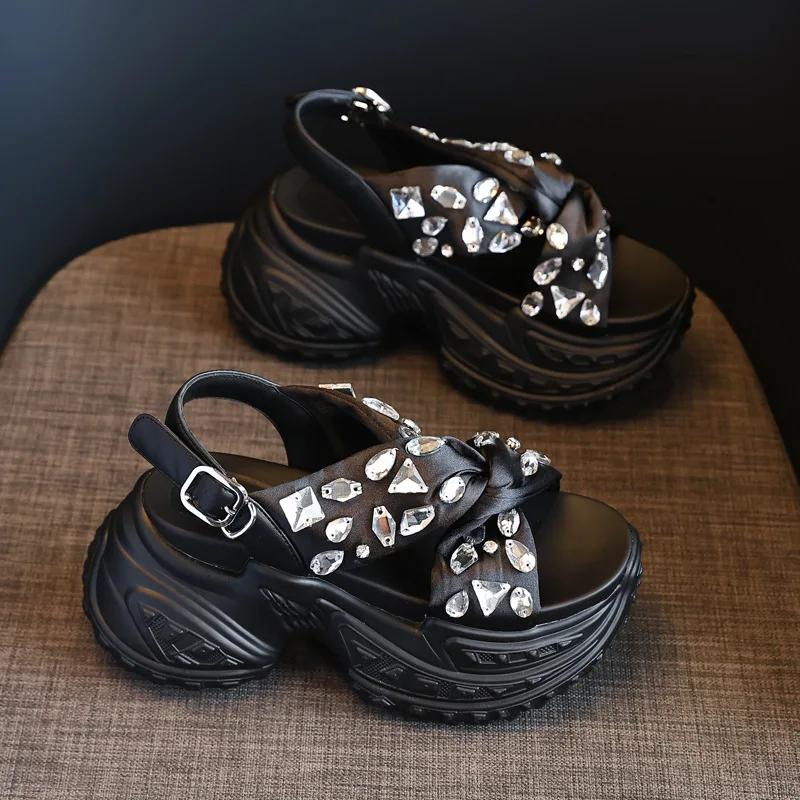 Модные женские босоножки на танкетке из синтетической ткани 8 см, летние блестящие повседневные туфли с открытым носком, тапочки со стразами, полые