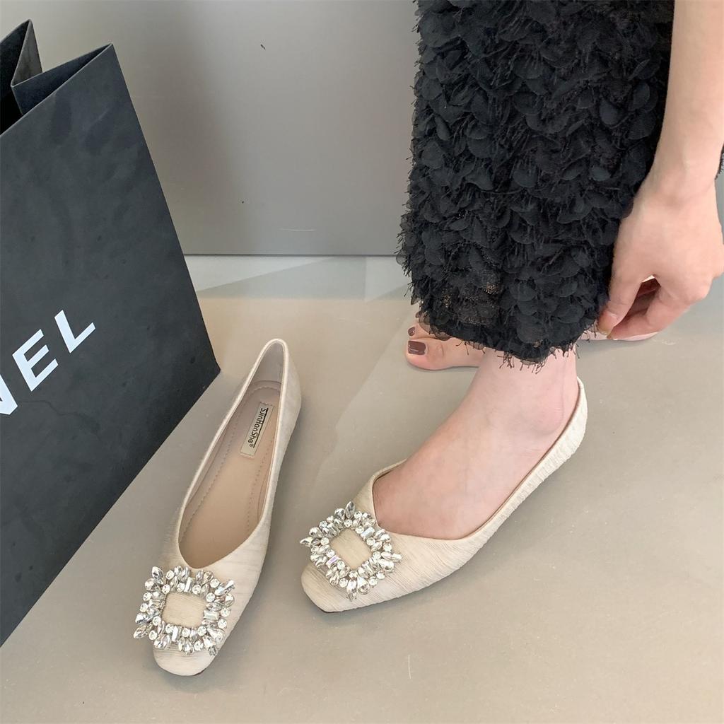 Модные балетки женские со стразами, квадратной пряжкой, с мелким вырезом, весенне-осенние, на плоской подошве, повседневные, больших размеров