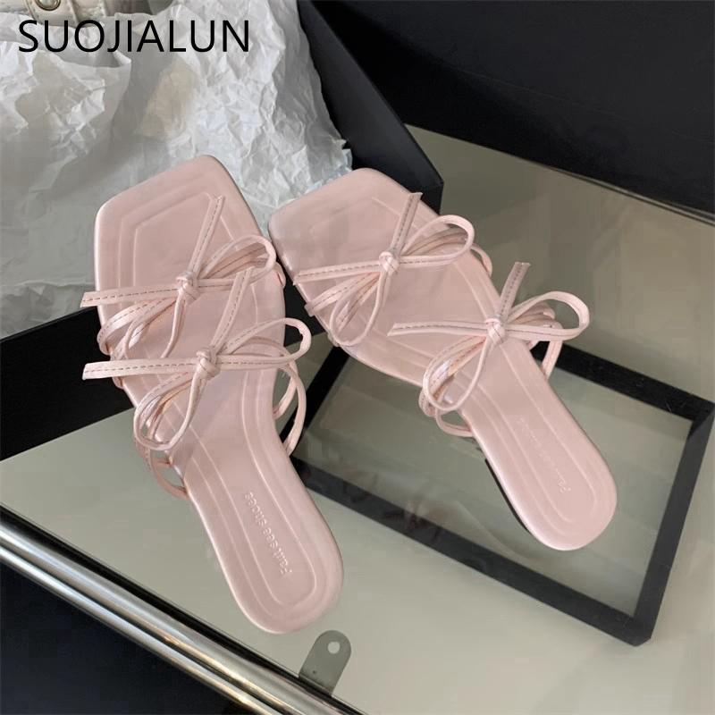 Fashion SUOJIALUN 2025 Summer New Brand Women Slipper Fashion Bow-knot Square Toe Slip On Ladies Slides Shoes Flat Heel Beach Sandal Sho