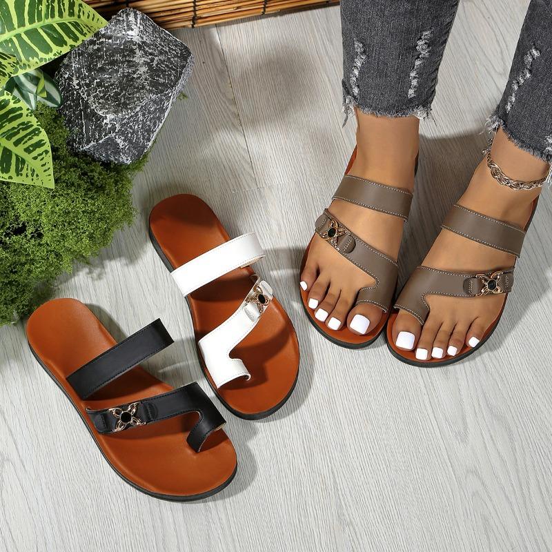Модные шлепанцы-вьетнамки с перемычкой для пальца для женщин, летние, новые, пляжные, металлические сандалии для женщин, модная мягкая подошва, нескользящая женская обувь, шлепанцы