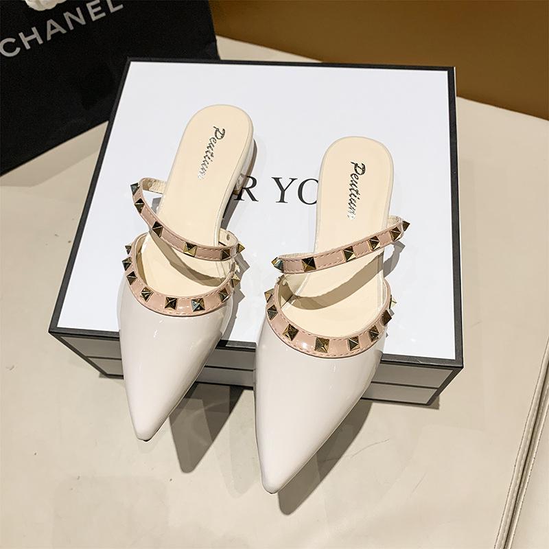 Баотоу остроносые холодные тапочки женские весенне-летние новые для улицы на толстом каблуке тапочки заклепки темперамент универсальные женские туфли тренд