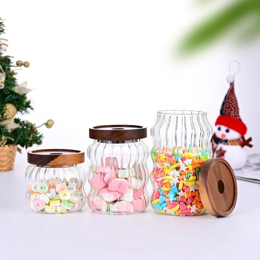 Деревянная крышка Полосатая стеклянная бутылка для хранения Запечатанная банка Чай Кофе Зерна Зерна Банки для конфет Органайзер Кухонная еда Стеклянные контейнеры