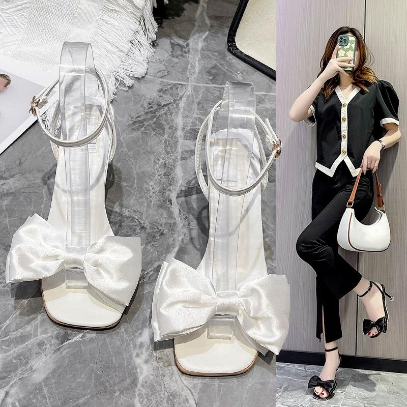 Мода 2024 Новые Летние Сексуальные Высокие Каблуки Модные Босоножки на Тонком Каблуке с Бантом, Ремешком на Пуговице, Открытым Носком и Квадратным Носком