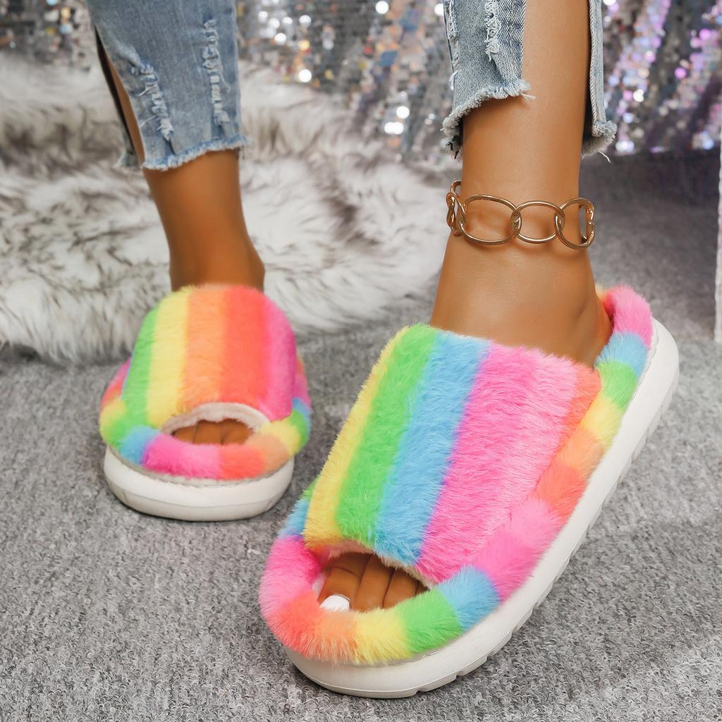 Модные теплые зимние плюшевые пушистые тапочки для женщин Новая мода Открытый носок Комфортные пушистые тапочки Домашние теплые мягкие меховые тапочки