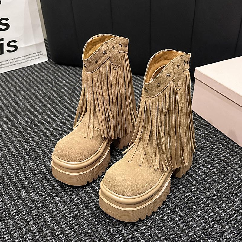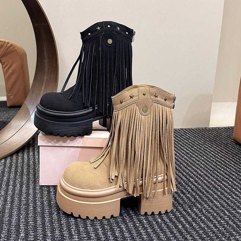 Модные женские туфли на высоком каблуке с кисточками, 9 см, толстая платформа, короткие ботинки, замшевые массивные туфли, женские осенне-зимние ботинки на платформе, мотоботы, боты