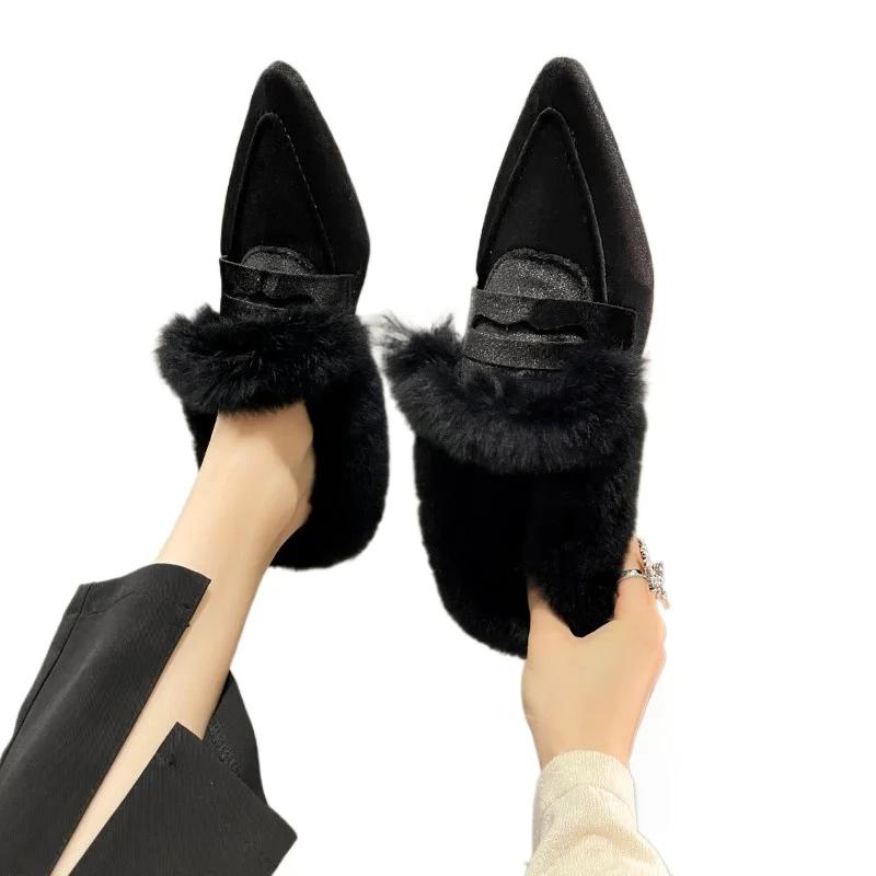 Модные меховые женские балетки, хлопковые ботинки с острым носком из замши, теплая обувь 2024 зима, дизайнерские зимние ботинки, короткий плюш, для ходьбы, сексуальная женская обувь