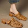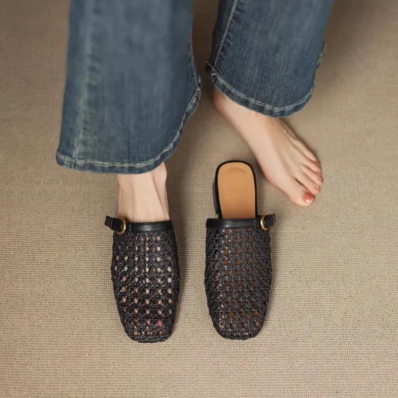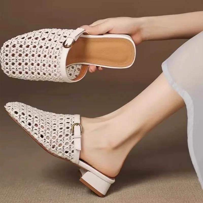 Модные женские винтажные плетеные дышащие полуслипы с вырезами, элегантные повседневные шлепанцы на блочном каблуке