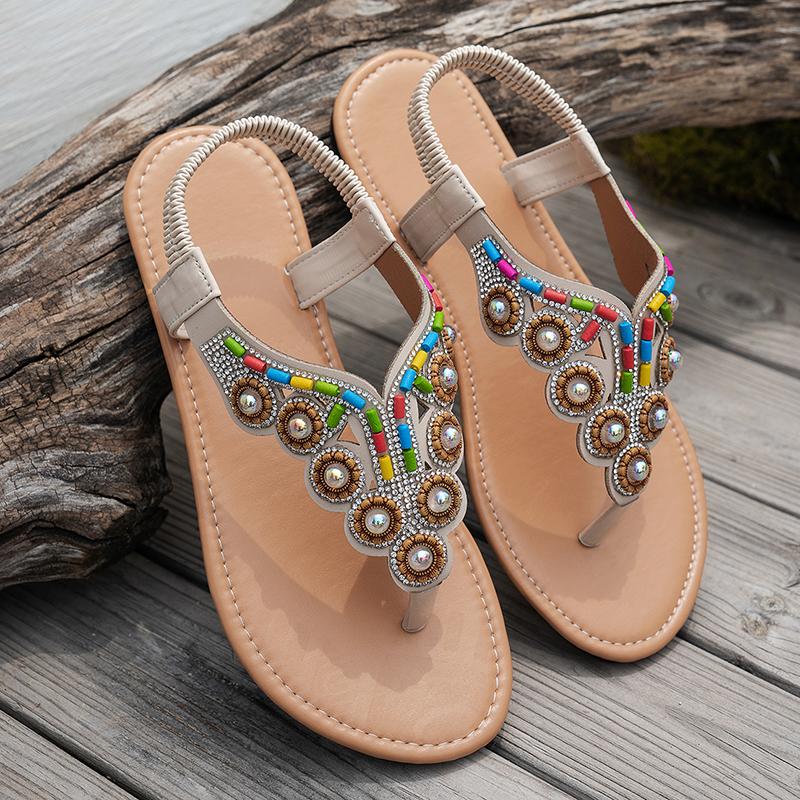 Fashion Bohemian String Bead Flat Sandals Women 2025 Summer Crystal Decor Clip Toe Beach Sandles Woman Plus Size Non Slip Sandalias 43