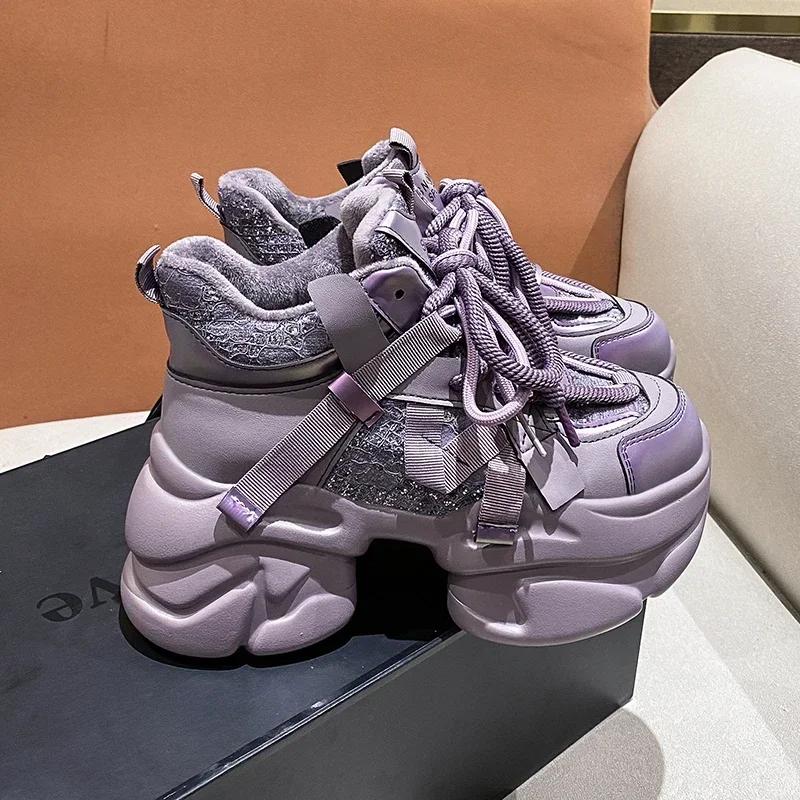 Модная зимняя женская массивная теплая меховая обувь 8 см высокая платформа спортивная обувь для папы женская блестящая кожаная повседневная зимняя обувь Zapatillas Mujer