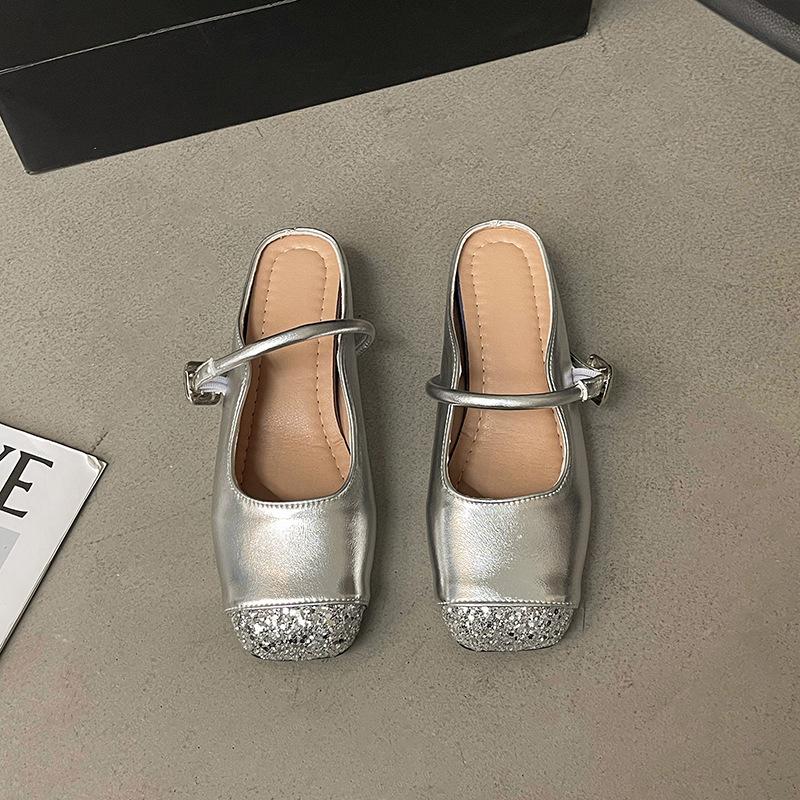 Модные Горячие Продажи 2025 Серебристые Женские Балансовые Тапочки Полу-Шлепанцы Подошва Круглый Носок Соединяющиеся Балетки с Кулиской Мэри Сандалии