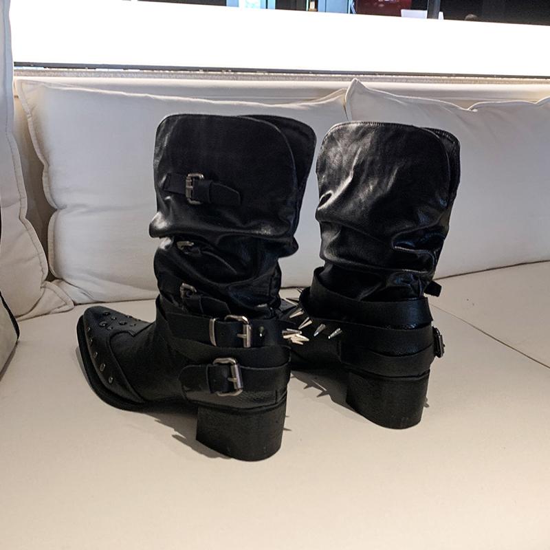 Модные панк Sle Ro готические рыцарские ботинки женские ботинки с заклепками шик для девочек с острым носком высокие ботинки кожаный внутренний материал резиновая подошва обувь