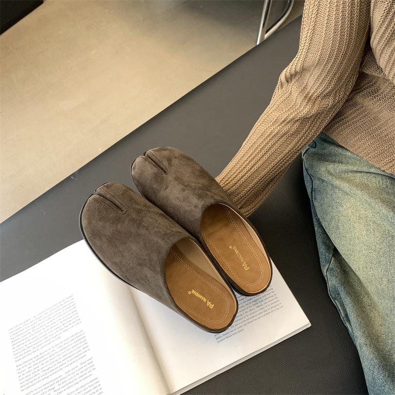 Модные женские меховые тапочки с раздельным пальцем Таби Ниндзя слипоны на плоской подошве с круглым носком неглубокие ленивые туфли-лодочки с ремешком через пятку мюли мягкая теплая повседневная обувь