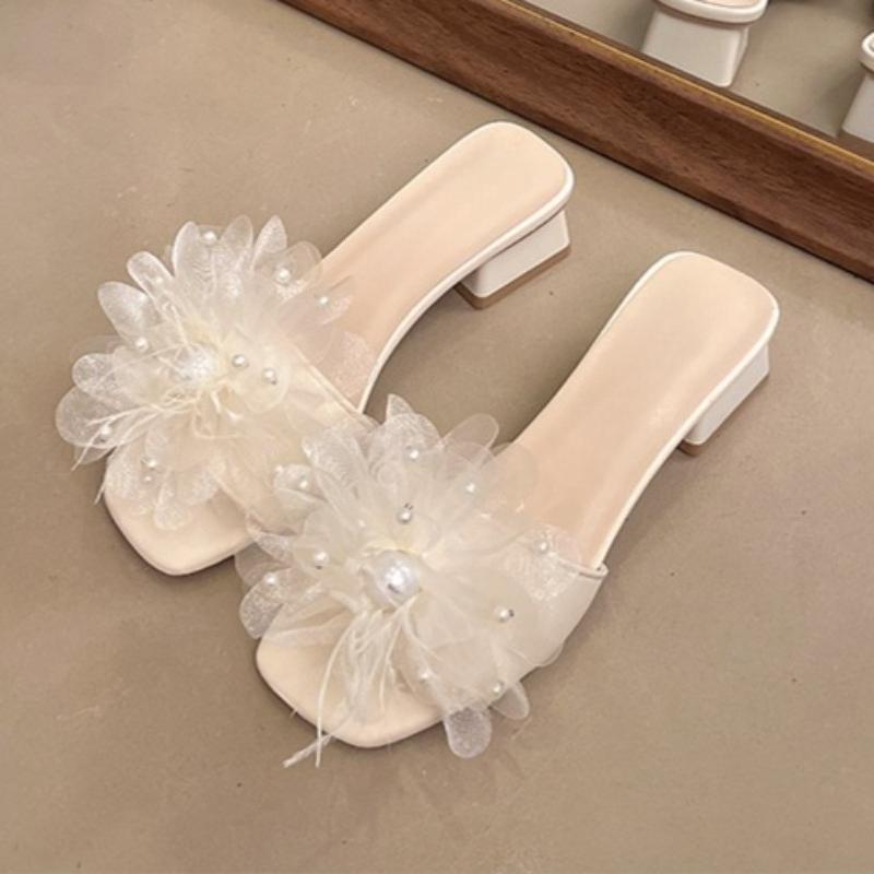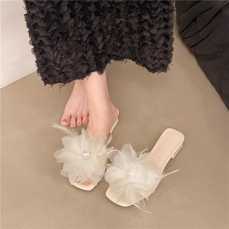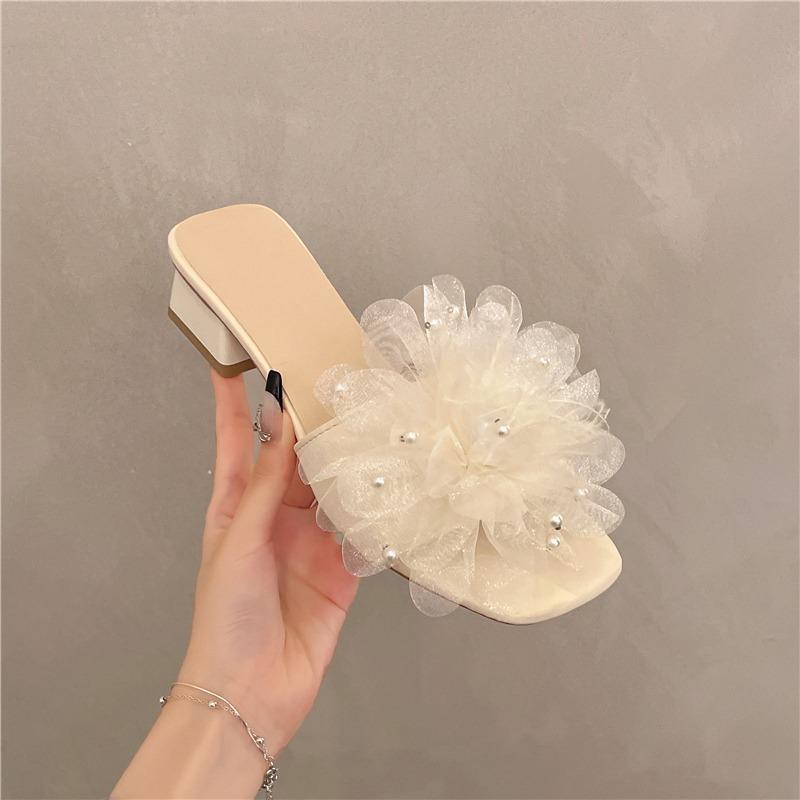 Модные жемчужные кружевные цветочные шлепанцы летние новые с квадратным носком и открытым носком на мягкой подошве, нескользящие, на квадратном каблуке, женские крутые шлепанцы
