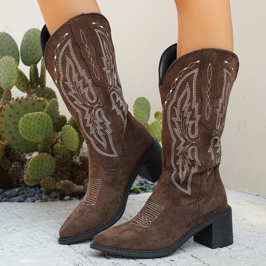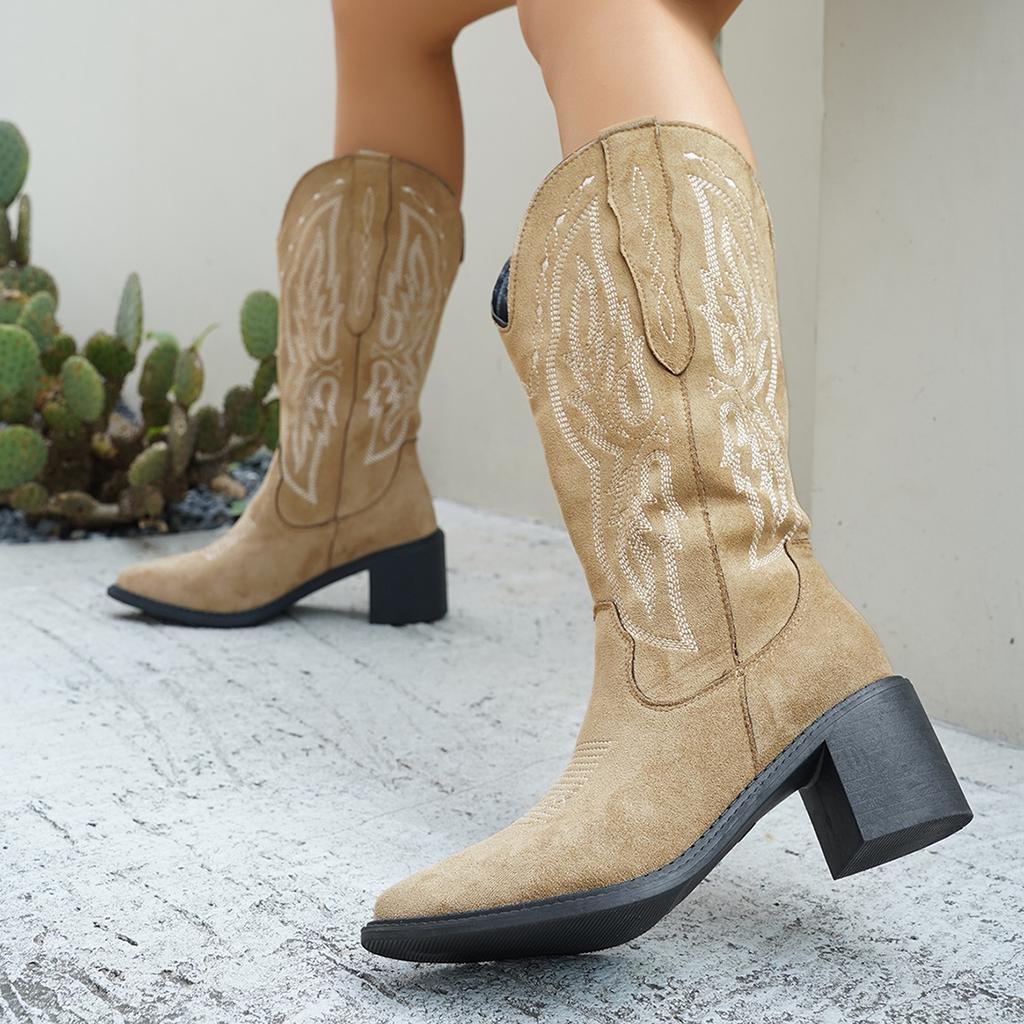 Модные женские вышитые ковбойские сапоги большого размера, остроносые высокие сапоги средней высоты в рыцарском стиле