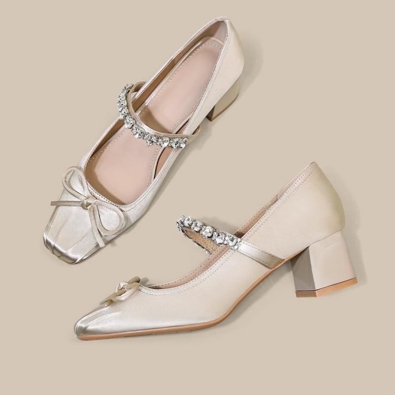 Модные Горячие Продажи 2025 Новые Балетки в Китайском Стиле с Кристаллами Мэри Джейн Квадратный Носок Высокий Каблук Одинарная Обувь для Платьев