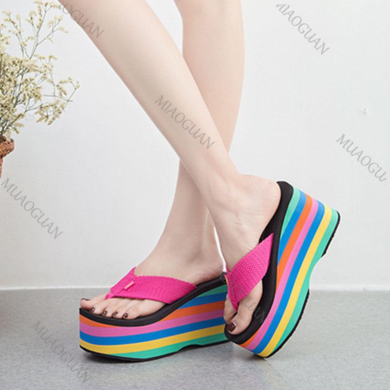 Модные женские шлепанцы на платформе Летняя обувь Мода 10см Супер высокий каблук Радужные сандалии на толстой подошве Тапочки для отдыха Пляжные шлепки — купить товар онлайн с бесплатной доставкой по всему миру!