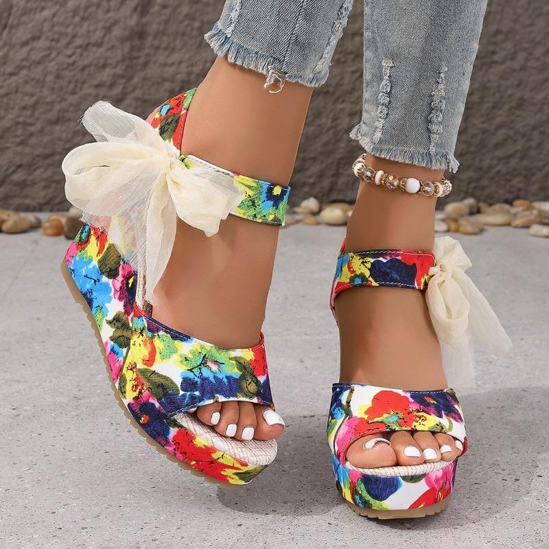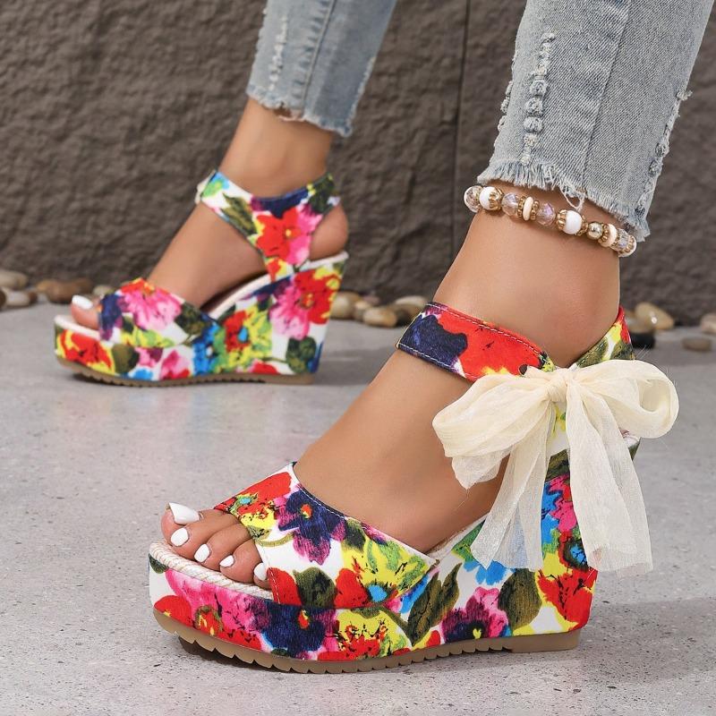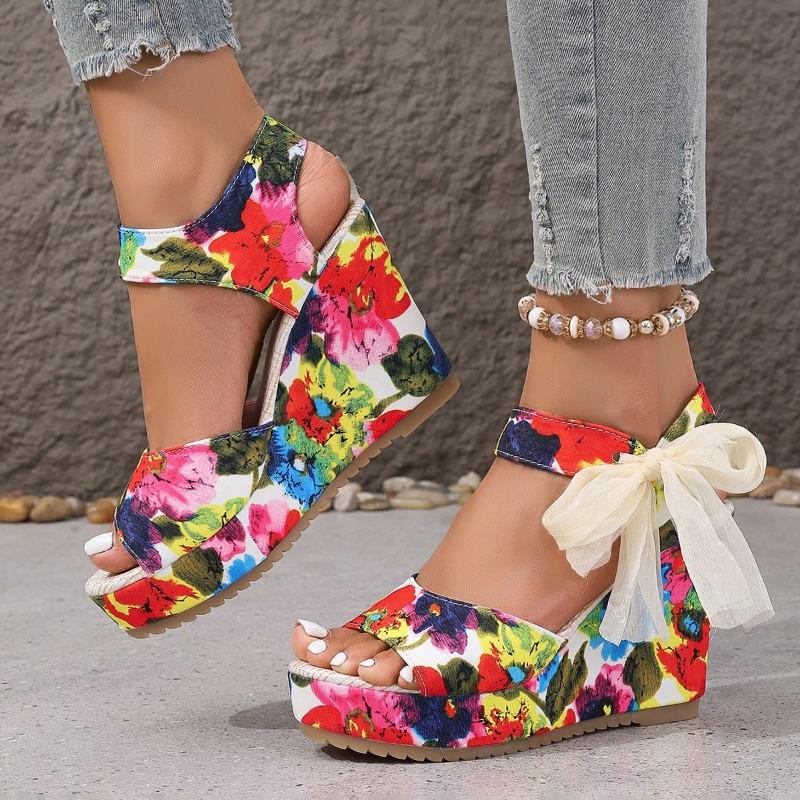 Fashion Women's High-heeled Sandals Fashion Round Head Open-toe Printed Waterproof Platform Side Butterfly Hitch Heel Shoes