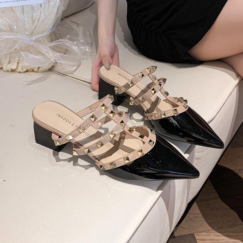 Модные туфли-лодочки с шипами, острым носком, лакированной кожей, блочным каблуком и высоким каблуком, летняя новинка 2025 года, женские туфли, полушлепки