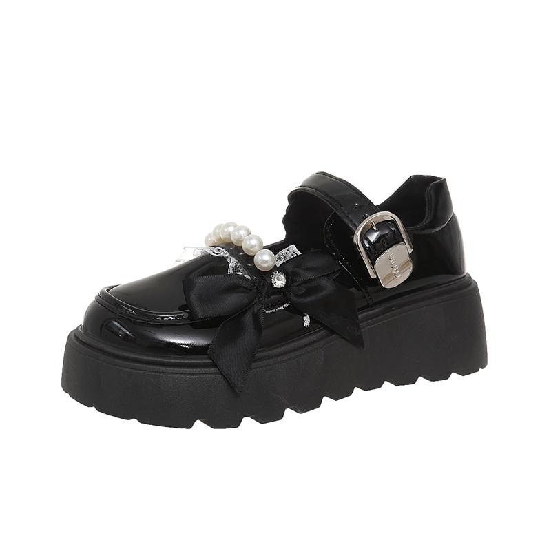 Fashion The 2025 autumn new lace pearl bow versatile round toe thick-soled one-line buckle shallow opening Mary Jane single shoe