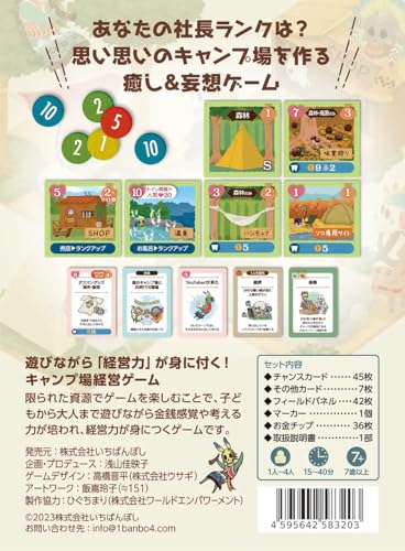 (1) Простые правила, но идеально сбалансированные для реиграбельности. Конечная цель игры проста: постройте самый популярный кемпинг и увеличьте продажи. Даже новички в настольных играх могут насладиться ею с самого первого раза. (2) Стратегический геймплей, требующий находчивого мышления. Эта игра также превосходна как управленческая игра. Средства и имеющийся персонал ограничены. Вы можете нанимать сотрудников, но чтобы платить им зарплату, вы должны улучшить свой кемпинг и удобства, чтобы привлечь клиентов.. Закончившиеся средства означают, что игра заканчивается немедленно. Кроме того, при выполнении «действий», таких как строительство объектов, наем сотрудников и проведение мероприятий, вы соревнуетесь с другими игроками за ограниченные ячейки для объектов.. Мы позаботились о воссоздании этого баланса спроса и предложения. (3) Компоненты, позволяющие вести приятные переговоры. Карты событий включают карты «атаки», которые снижают популярность, и карты «стихийного бедствия», которые разрушают построенные объекты, вынуждая вас продать свой кемпинг из-за пренебрежения хеджированием рисков.. Как раз когда думаешь, что все кончено, все устраивают фестиваль, и он становится огромным хитом... Вас ждет захватывающая, как в кино, драма. Даже если вы встречаетесь впервые, вы можете завязать новые дружеские отношения, преодолевая препятствия.